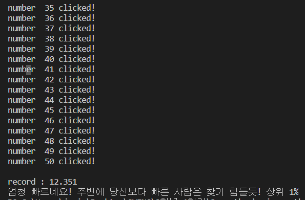 - count가 1일 때 xpath를 이용해 각각의 text가 뭐가 들어있는지 확인하고 1이면 .click()을 통해 클릭하고 count에 +1을 한 뒤 이를 계속 반복한다. 그러면 1~50까지 순서대로 클릭하여 게임을 끝낼 수 있다.