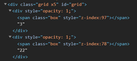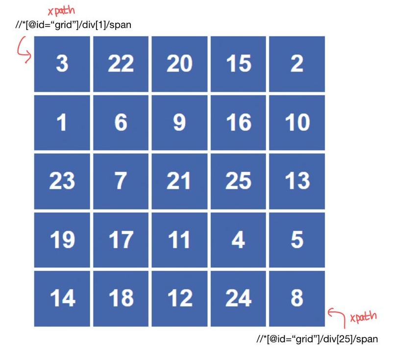 - 위에서부터 오른쪽으로 순서대로 xpath는 //*[@id="grid"]/div[N]/span으로 N에는 1~15가 들어간다.