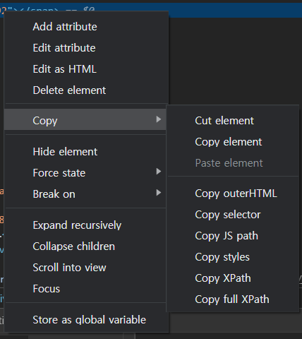 왼쪽과 같이 알고 싶은 경로에서 copy에 있는 copy XPath를 통해