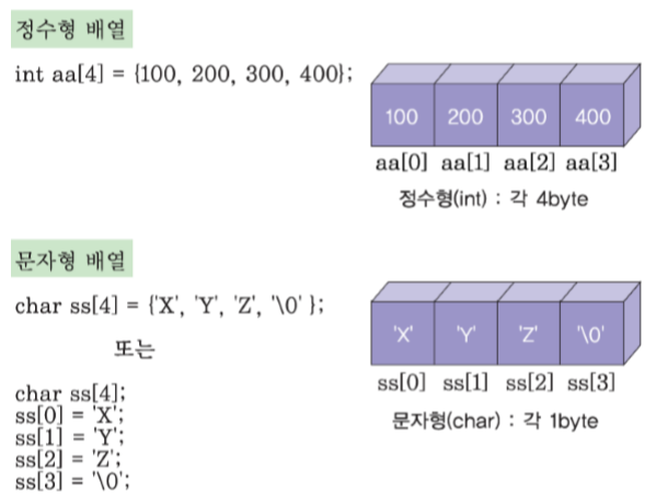 - 마지막에 '\0'로 널값을 넣어줘야 문자열이 됨