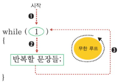 - 무한루프는 while(1)로 표현함 (1은 무조건 참이라는 뜻, 0은 false)
