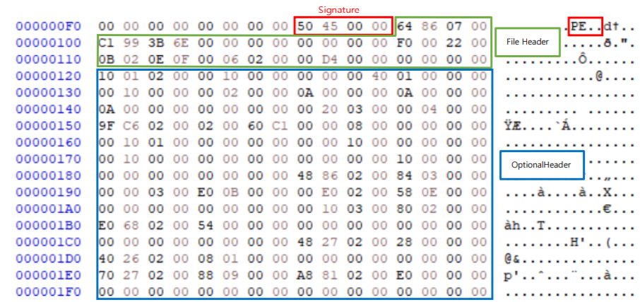 ▶ DWORD Signature : 이 시그니처로 해당 파일이 PE 파일 구조인지 아닌지 알 수 있다. 시그니처는 PE00으로 50 45 00 00으로 저장된다.