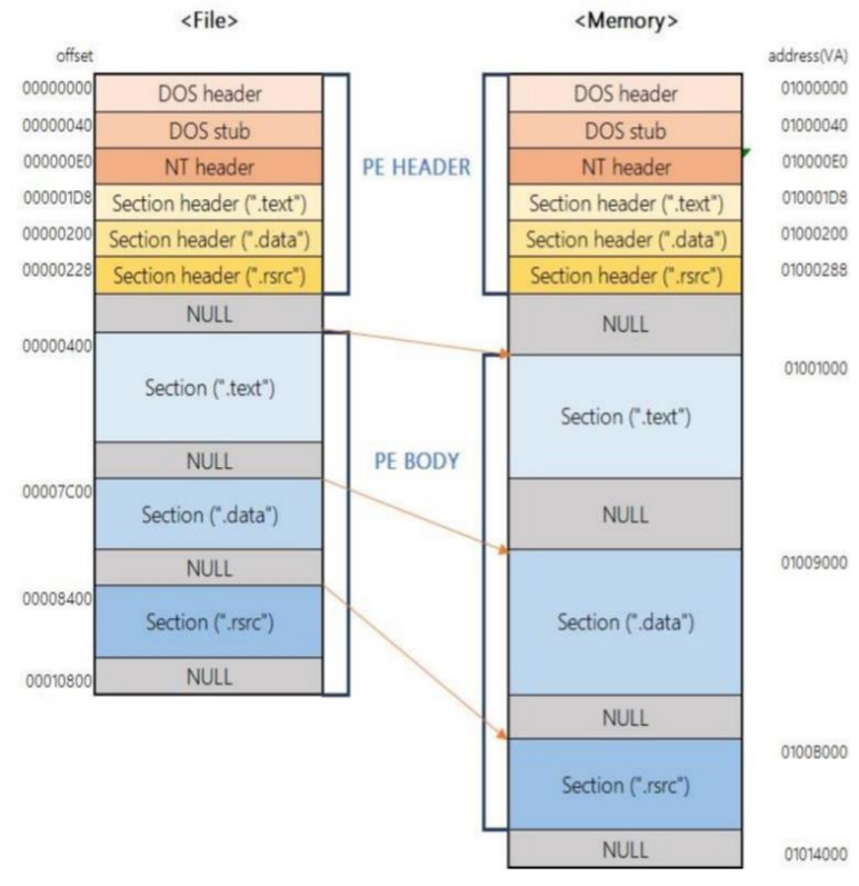 PE는 Portable Executable은 이식 가능한 실행 파일이라는 뜻으로 하나의 실행 파일을 여러 운영체제에서 실행 가능하다는 의미다. 유닉스 실행 파일 형식인 COFF(Common Object File Format)을 기반으로 exe, dll, obj, sys 등의 확장자를 가진 파일들이 이에 해당한다고 볼 수 있다.
