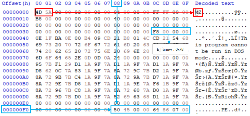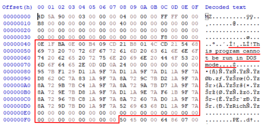 DOS Header에서 e_lfanew가 가변적인 이유가 바로 이 DOS Stub이 가변적이기 때문이다. 그렇기에 DOS Stub 밑에 있는 DOS Header의 e_lfanew의 필드 값이 변하는 것이다.