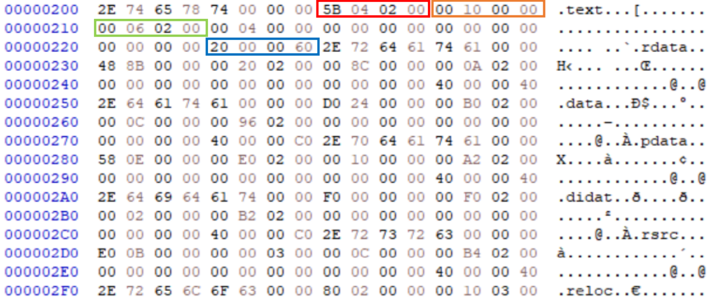▶ DWORD PointerToRawData : 파일에서 섹션의 시작 주소로 FileAlignment의 배수 값을 갖는다