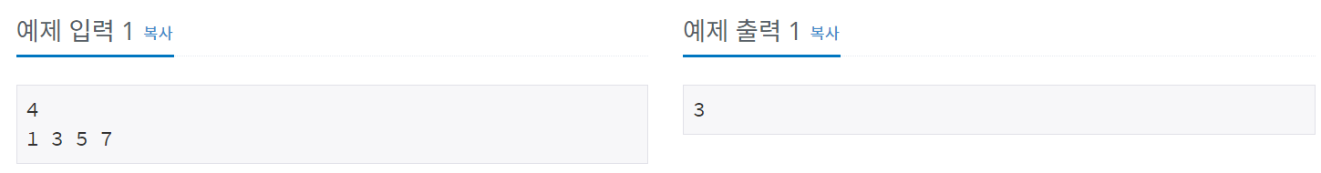 첫 줄에 수의 개수 N이 주어진다. N은 100이하이다. 다음으로 N개의 수가 주어지는데 수는 1,000 이하의 자연수이다.
